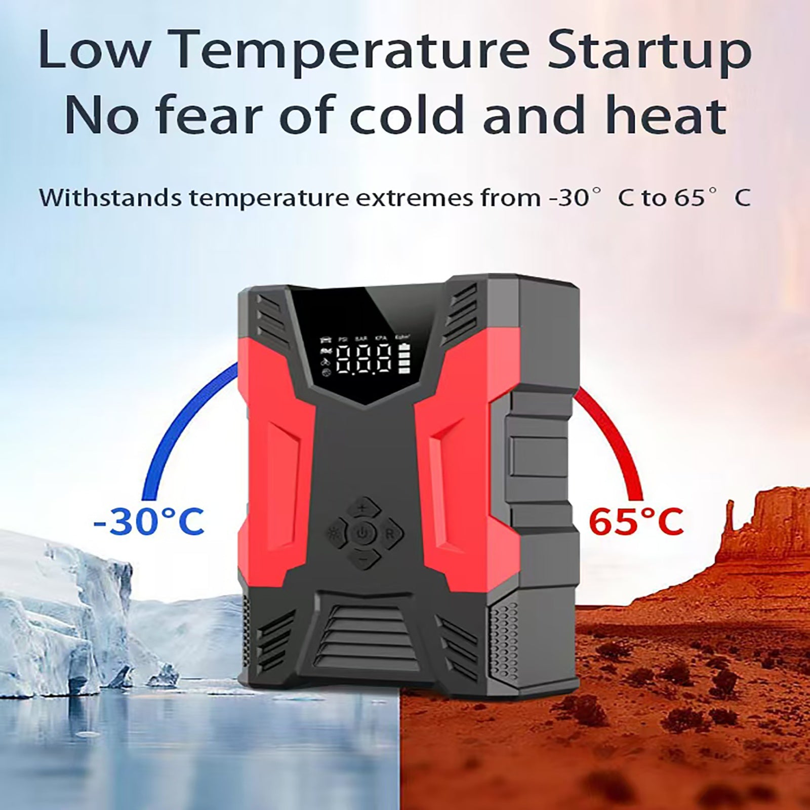 Model A11 High-Power Car Starter with Air Compressor is ideal for starting vehicles when the car battery is dead or in extremely cold weather. Its powerful peak current can start a vehicle in just a few seconds. It has a built-in air compressor with a maximum pressure of 150 PSI. Unlike traditional car jump starters with air compressors, the inflation hose is also built into the unit itself, saving more space. When the preset pressure is reached, the air compressor will automatically stop, and the digital display shows air pressure in real time.