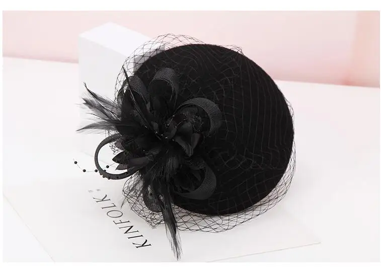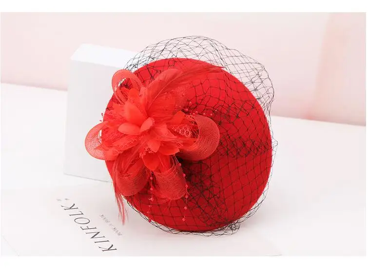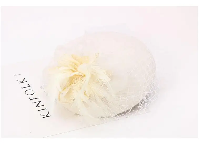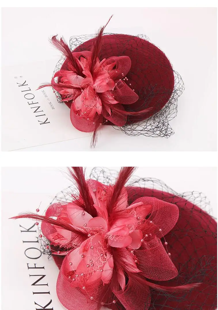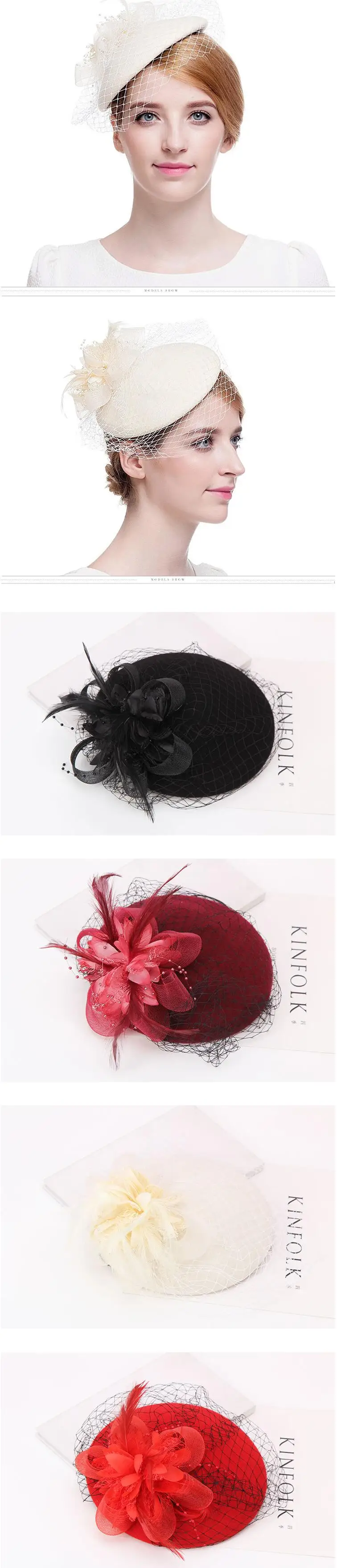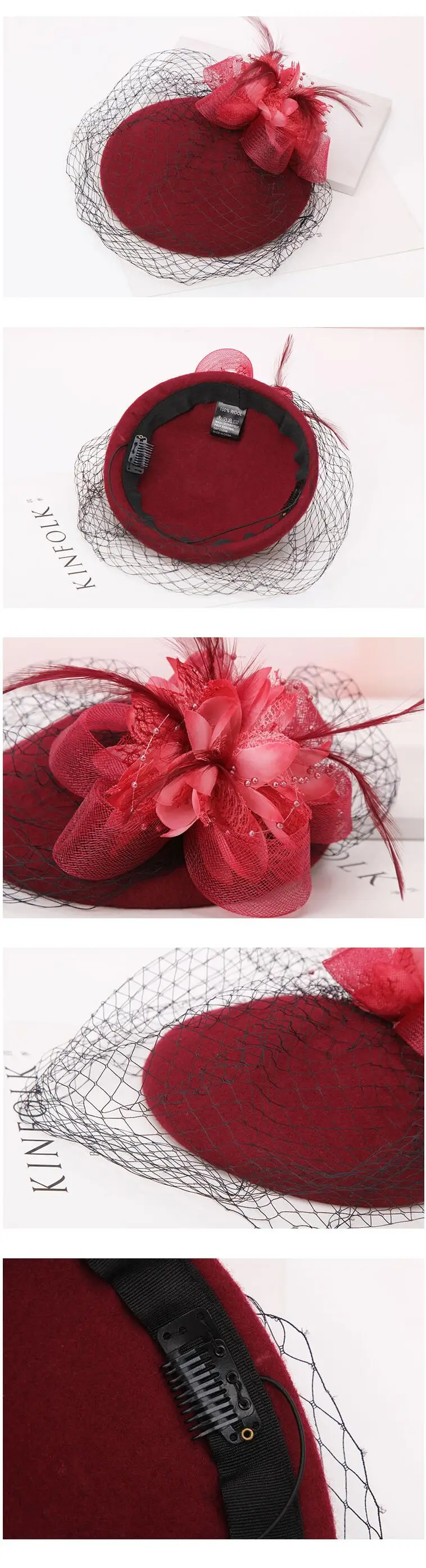 H297 Women British Retro Woolen Fedoras Hat Elegant Flower Gauze Mesh Wool Cap Ladies Vintage Casual Party Church Party Hats